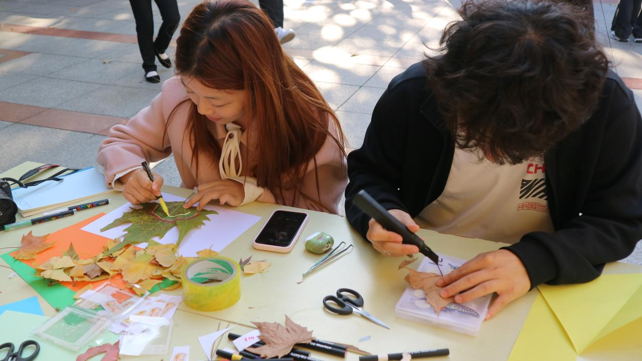 “赏秋”环节中,同学们化身“秋日捕手”,穿梭于赭山校区的林荫道、湖畔旁、草坪间,用手机或相机捕捉专属秋日的限定美景。金黄的银杏叶、火红的枫叶、斑驳的光影、澄澈的天空,都成为镜头下的主角。“拾秋”环节则充满了创意与趣味。同学们收集飘落的银杏叶、梧桐叶、枫树叶等自然素材,通过剪、折、粘、拼等手法,将零散落叶变为精美手工作品,每一件手工作品都凝聚着同学们的巧思与匠心,展现了丰富的创造力和动手能力。