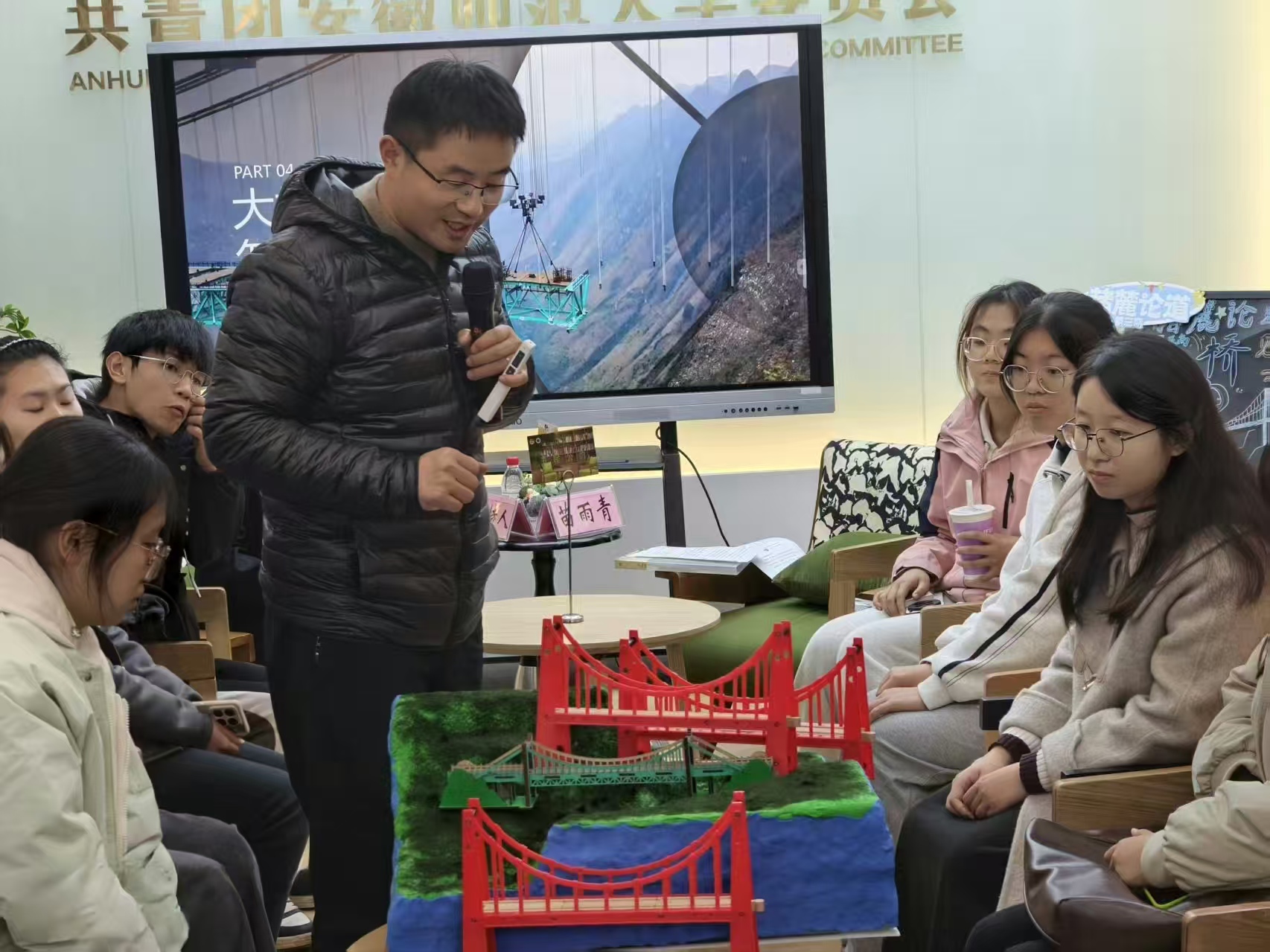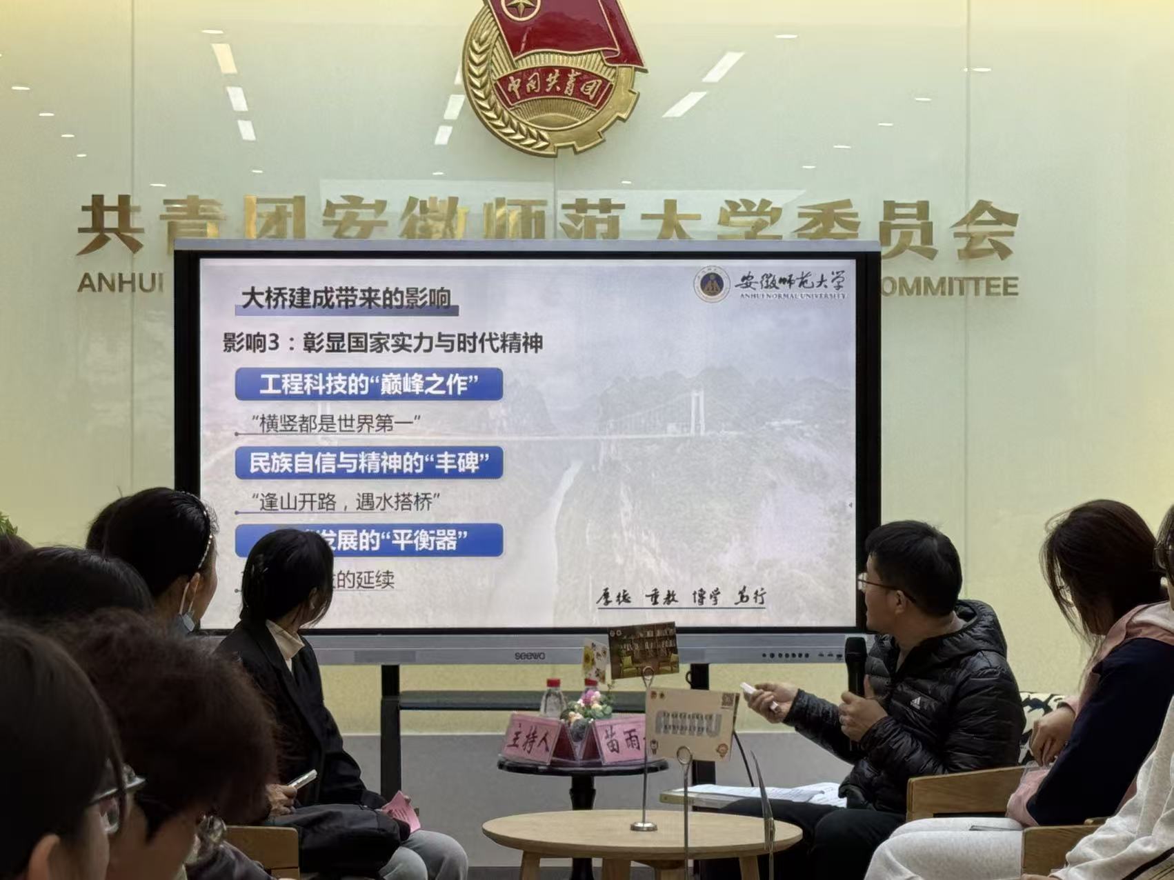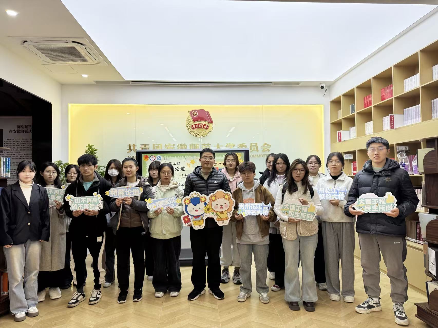 2025 年 11 月 26 日,由安徽师范大学学生会主办、地理与旅游学院学生会承办的第三期 “赭麓论道”青年学术沙龙,在花津校区大学生活动中心望道书屋顺利举行。本次活动以 “‘桥’见未来:从大国工程看中国智慧与人民获得感” 为主题,特邀地理与旅游学院副教授苗雨青老师主讲,15 名全校不同专业本科生参与,通过主题分享、互动思辨、实操模拟等形式,共探贵州花江峡谷大桥的地理逻辑与发展价值。