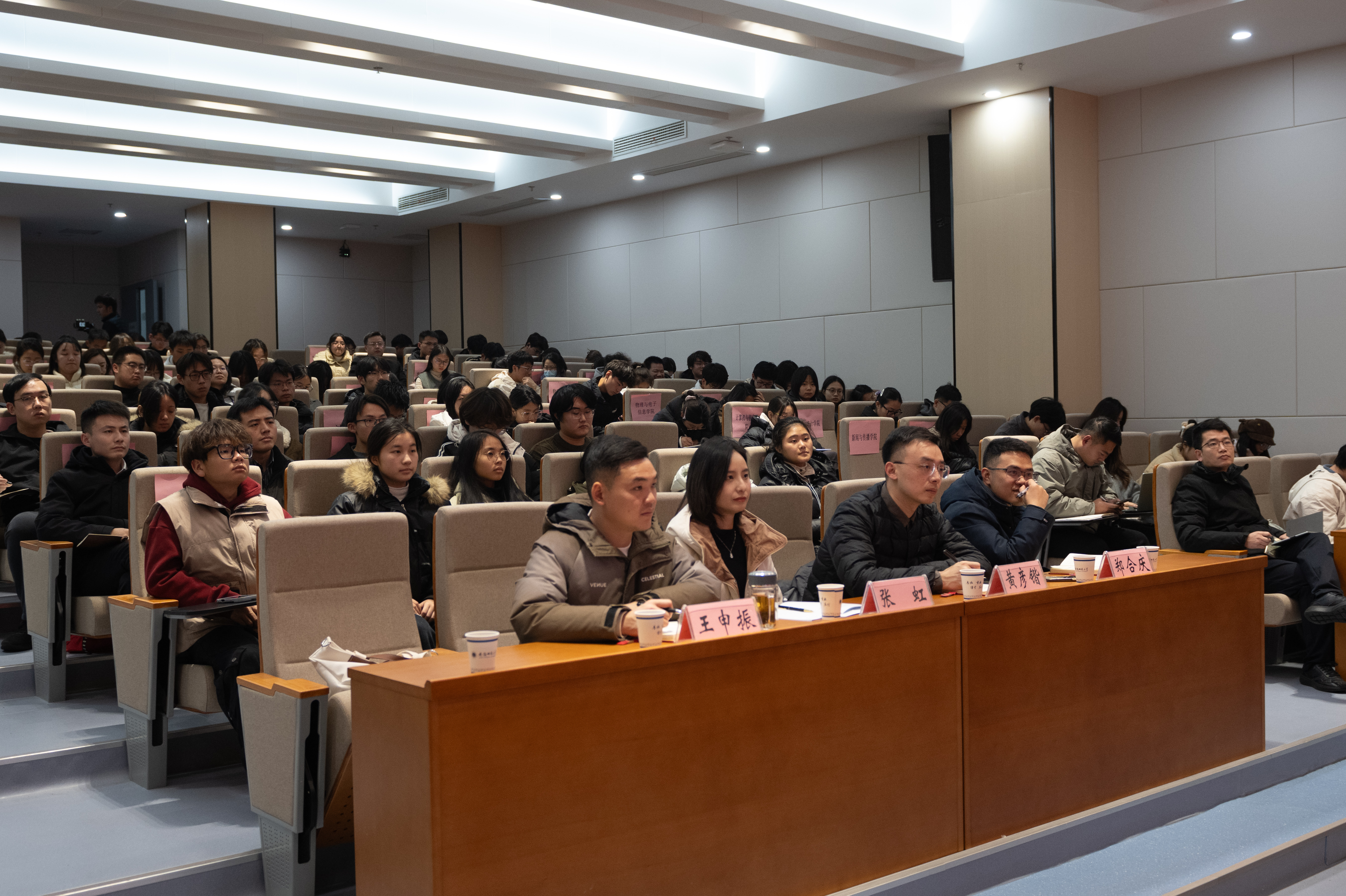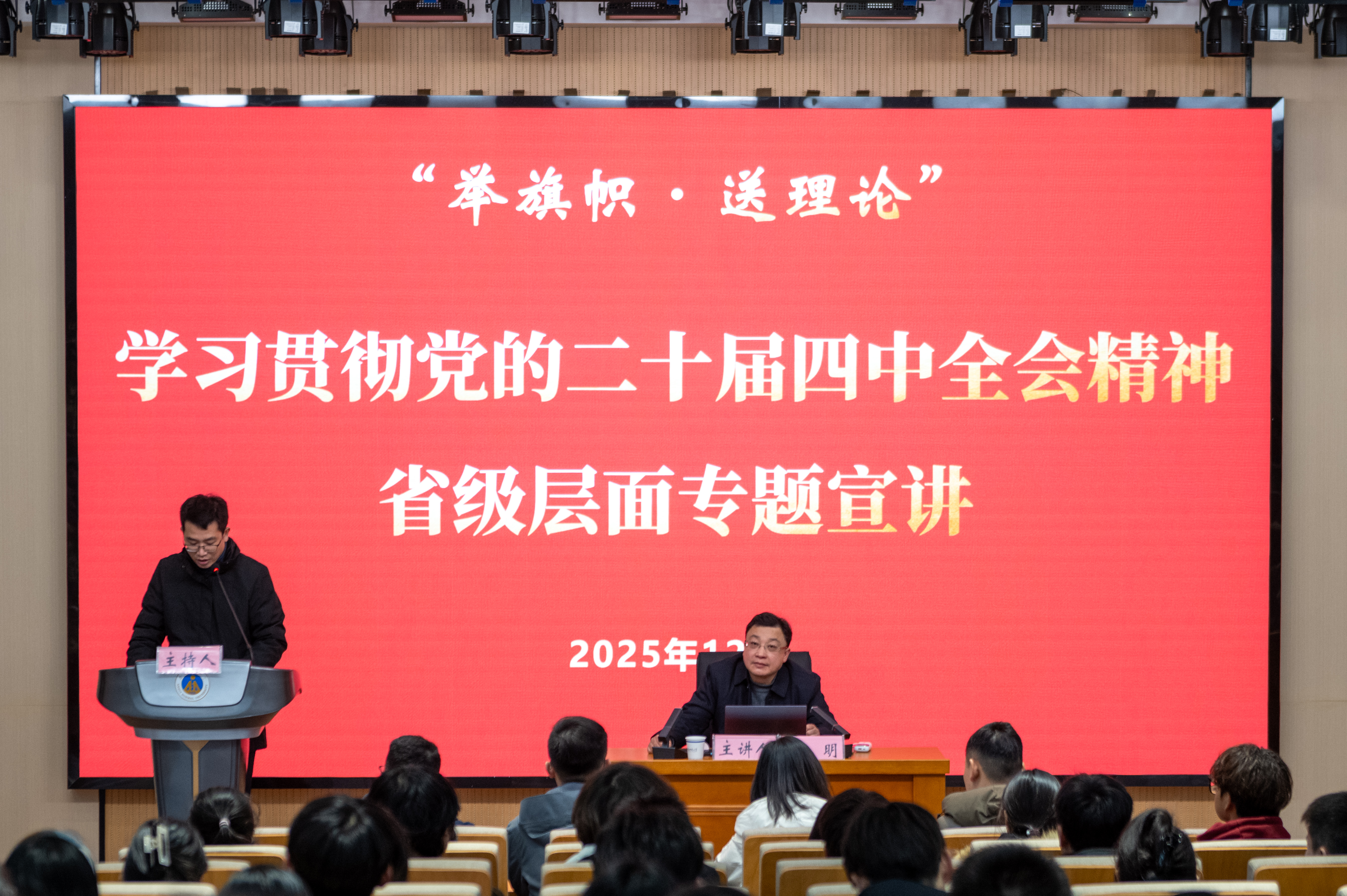 12月24日下午省委讲师团“举旗帜·送理论”学习贯彻党的二十届四中全会精神省级层面专题宣讲在望道楼E101报告厅举行。本次宣讲特邀安徽省委讲师团高端宣讲专家、安徽大学马克思主义学院院长、教授、博士生导师,安徽省公共关系学会会长李明作专题辅导。各学院团委书记、相关教师代表,以及各学院学生兼职副书记、学生组织主要负责人、学生骨干和思想政治教育专业本科生代表180余人参会。