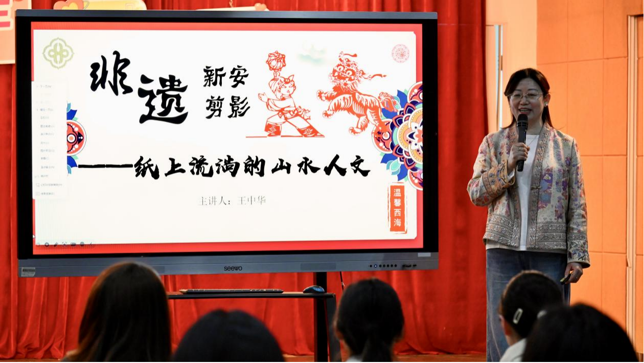 活动在非遗剪纸旗袍秀与非遗变脸表演中拉开帷幕,模特们身着融入剪纸元素的旗袍款款而行,变脸艺人以瞬息万变的脸谱演绎非遗绝技,赢得现场阵阵掌声。随后,王中华老师以“纸上流淌的山水人文”为主题,从“方士剪桐叶”的传说切入,系统梳理了中国剪纸从北朝五幅团花到唐宋元明清的发展脉络,并重点介绍了扎根徽州大地的“新安剪影”艺术,阐释了其“题材的山水性、刀法的刚劲感、构图的叙事性、色彩的节制感”四大特色。互动提问环节中,同学们围绕剪纸历史、非遗传承等问题踊跃抢答,现场气氛热烈。