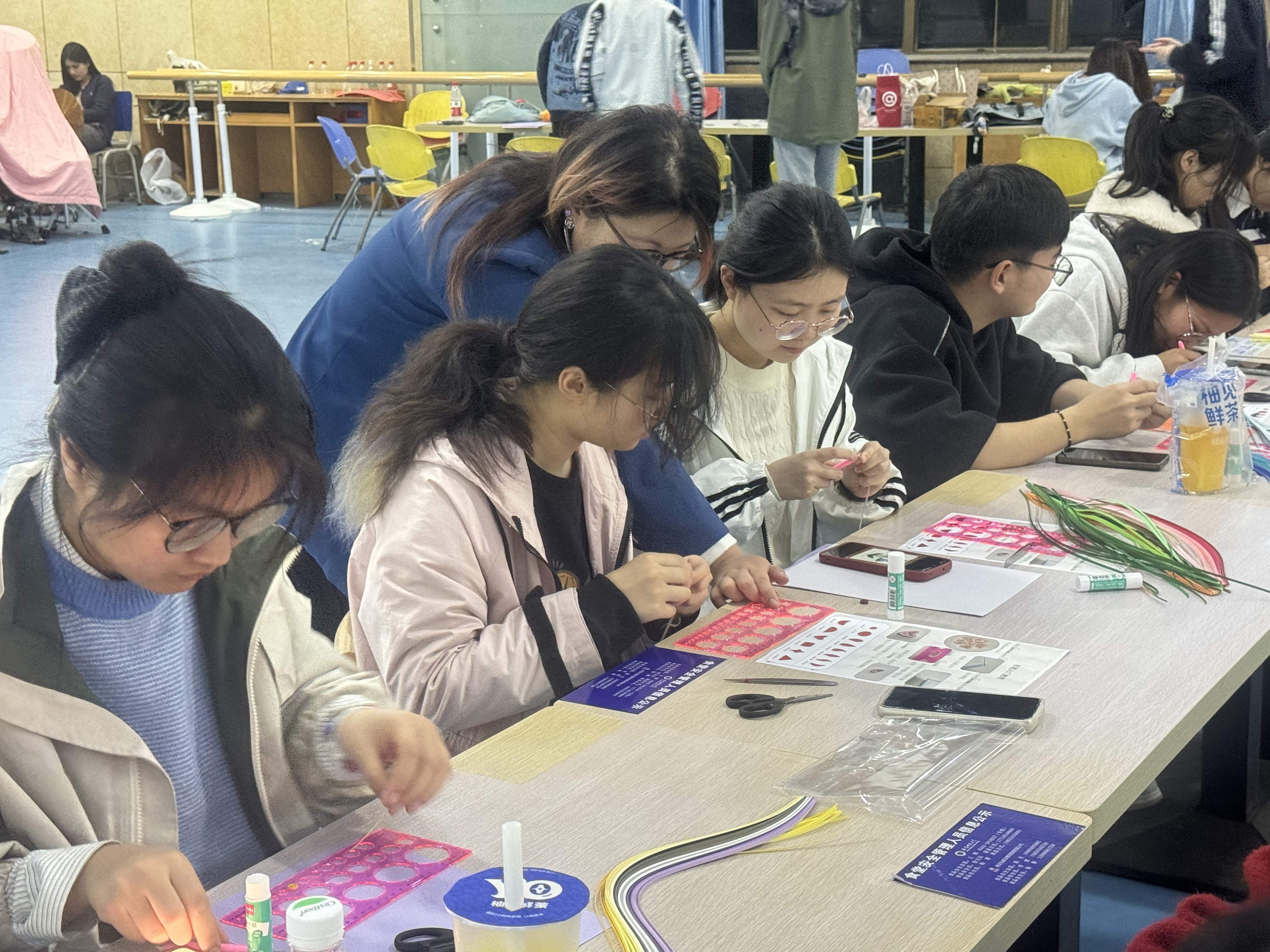 活动中,非遗青年社刘潇懿同学围绕衍纸艺术的起源、发展脉络与文化内涵展开讲解,带领同学们在卷、捏、粘的指尖创作中感受传统工艺的精巧与温度。实践环节里,同学们认真学习基础技法,在社团成员指导下完成各具巧思的衍纸作品,现场氛围轻松热烈。