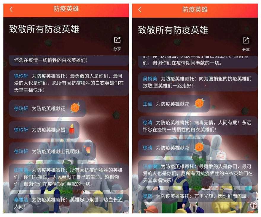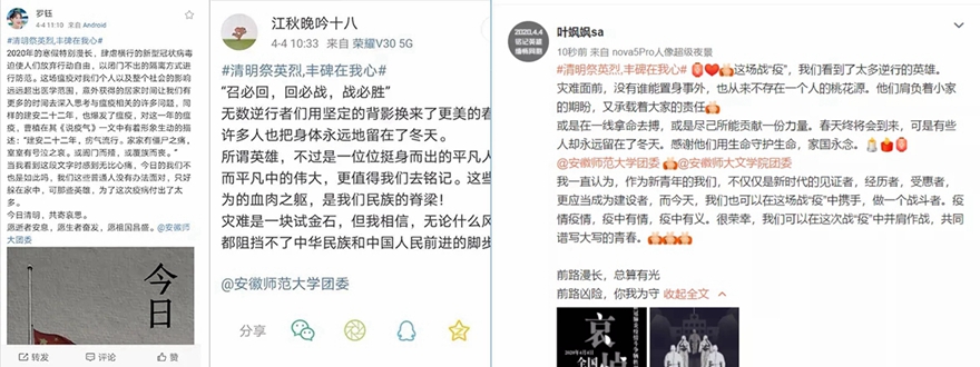 在#清明祭英烈,丰碑在我心#话题下,文学院团员青年通过微博发表学习体会,致敬英烈。微博名为“山山而川1999”的同学说:“从寒冬到春天,多少人用肩膀书写责任,用生命守护生命。这场战‘疫’,有许多冲锋在疫情防控一线的‘最美逆行者’永远离开了我们。他们是平凡而伟大的‘普通’人。”微博名为“叶飒飒sa”的同学说:“作为新青年的我们,不仅仅是新时代的见证者、经历者、受惠者,更应当成为建设者。”