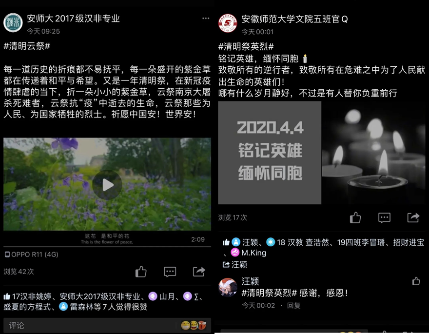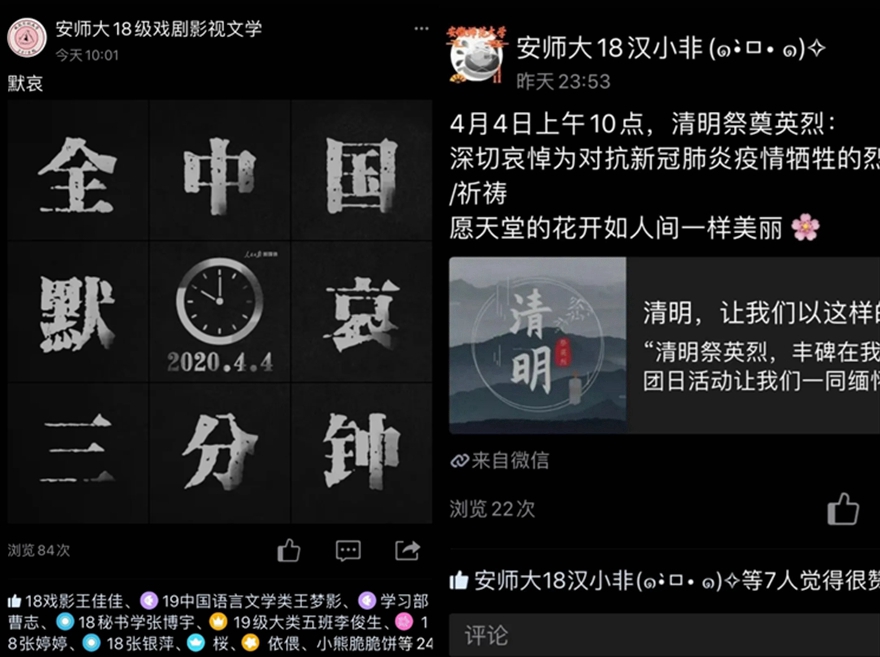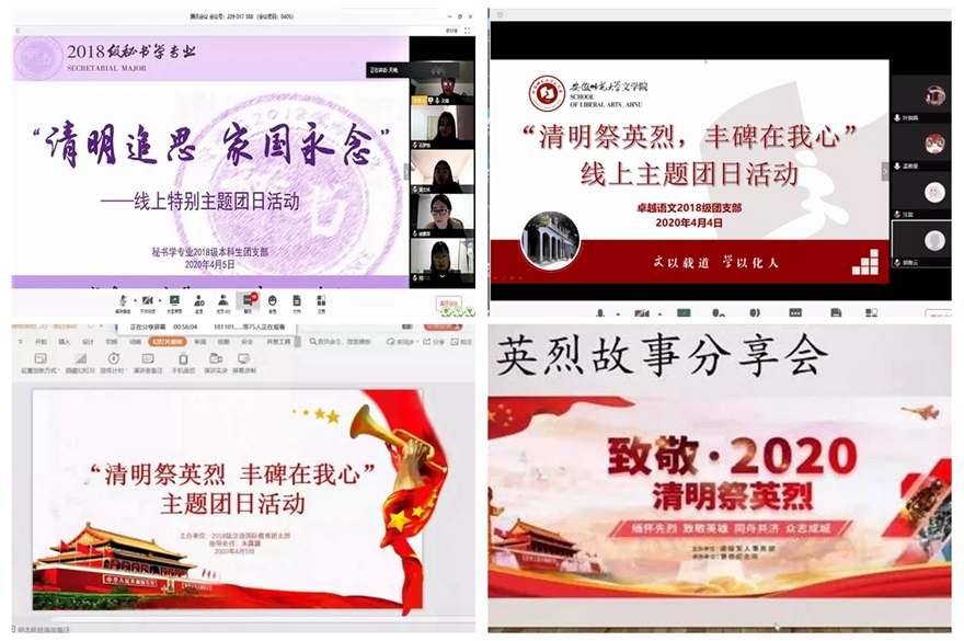 4月4日上午十时,伴着防空警报的鸣响,文学院广大团员青年在所在地默哀三分钟,表达对牺牲烈士和逝世同胞的深切哀悼。清明节期间,文学院团员青年线下自主学习习近平总书记3月10日《在湖北省考察新冠肺炎疫情防控工作时的讲话》,收看电视节目《这就是中国》第49期《全球抗疫中的中国担当》。同时,学子们登录中华英烈网“清明祭英烈”专栏,参与网上祭扫英烈活动,学习革命先烈的英雄事迹和伟大精神,写下感言寄语;积极登录软件“皖事通”,开展清明“云祭祀”。
