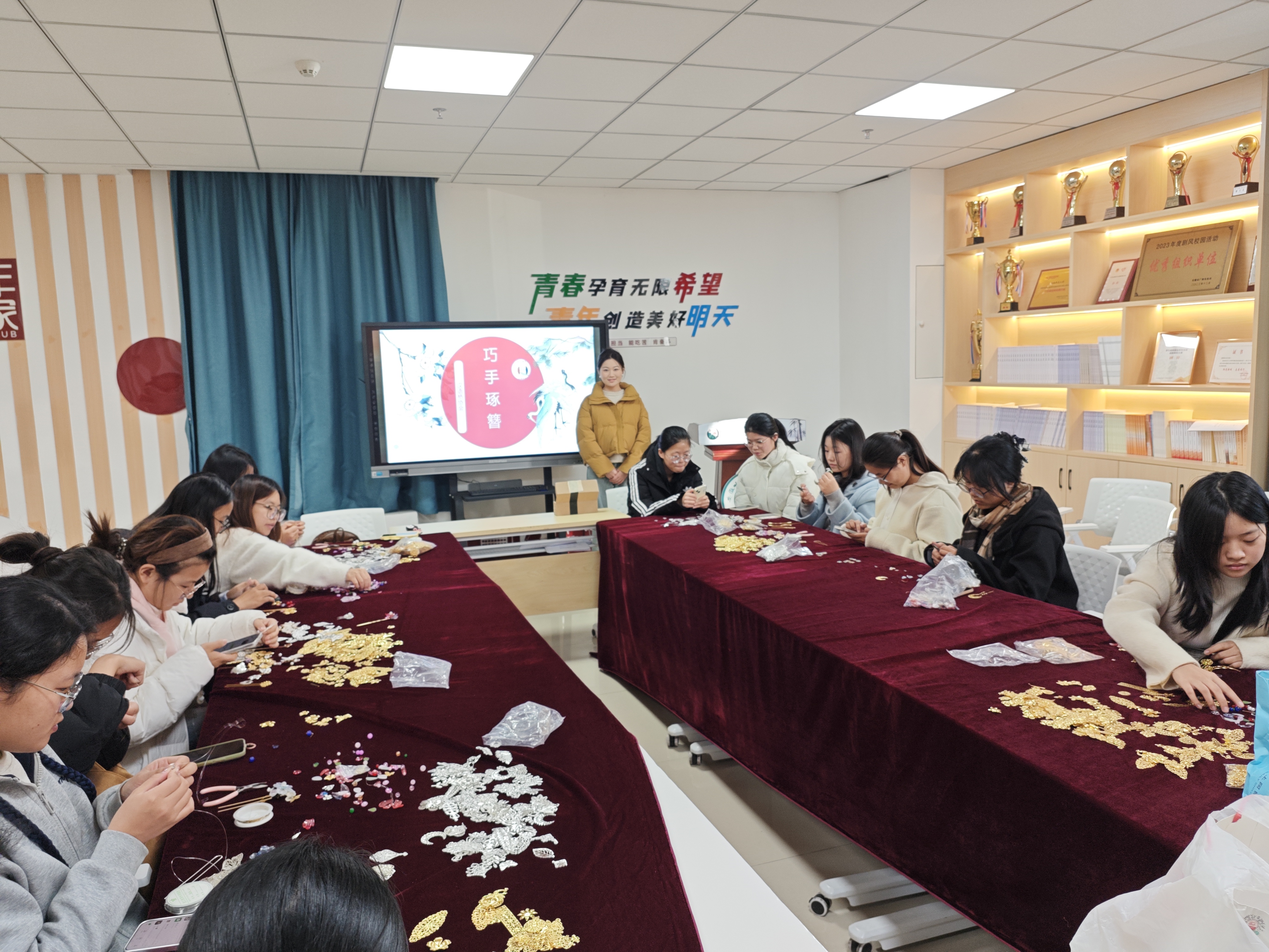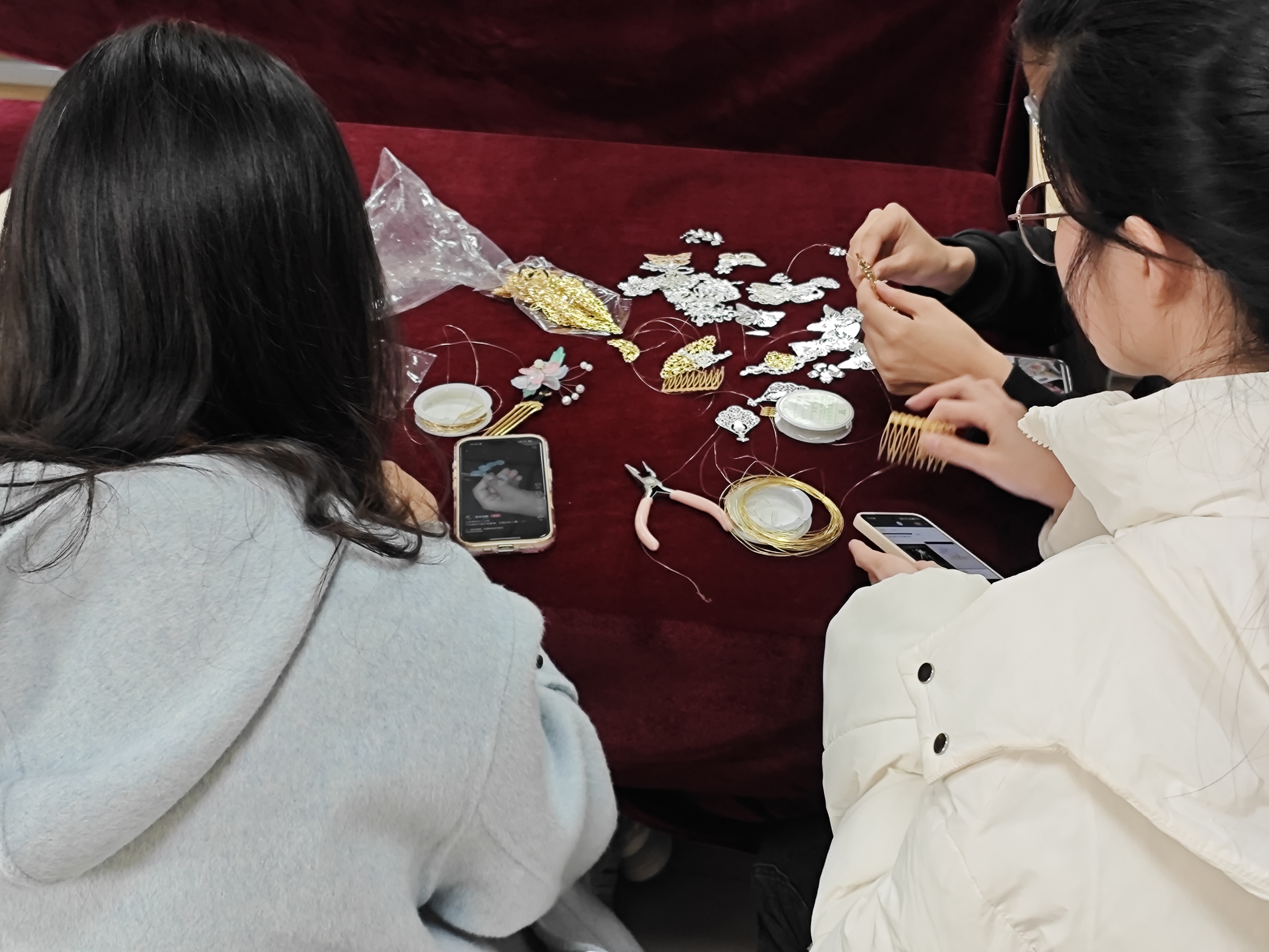 活动伊始,工作人员通过PPT与视频,系统讲解发簪从商周骨笄到唐宋金玉钗的历史演变,阐释其作为束发工具与礼仪象征的双重文化内涵。随后,理事团队现场演示选片、串珠、嵌合、固定等制作关键步骤,细致拆解技法要领。活动现场备有金属花片、点翠画片、玉石珠饰等丰富材料,为会员创意创作提供充足支持。