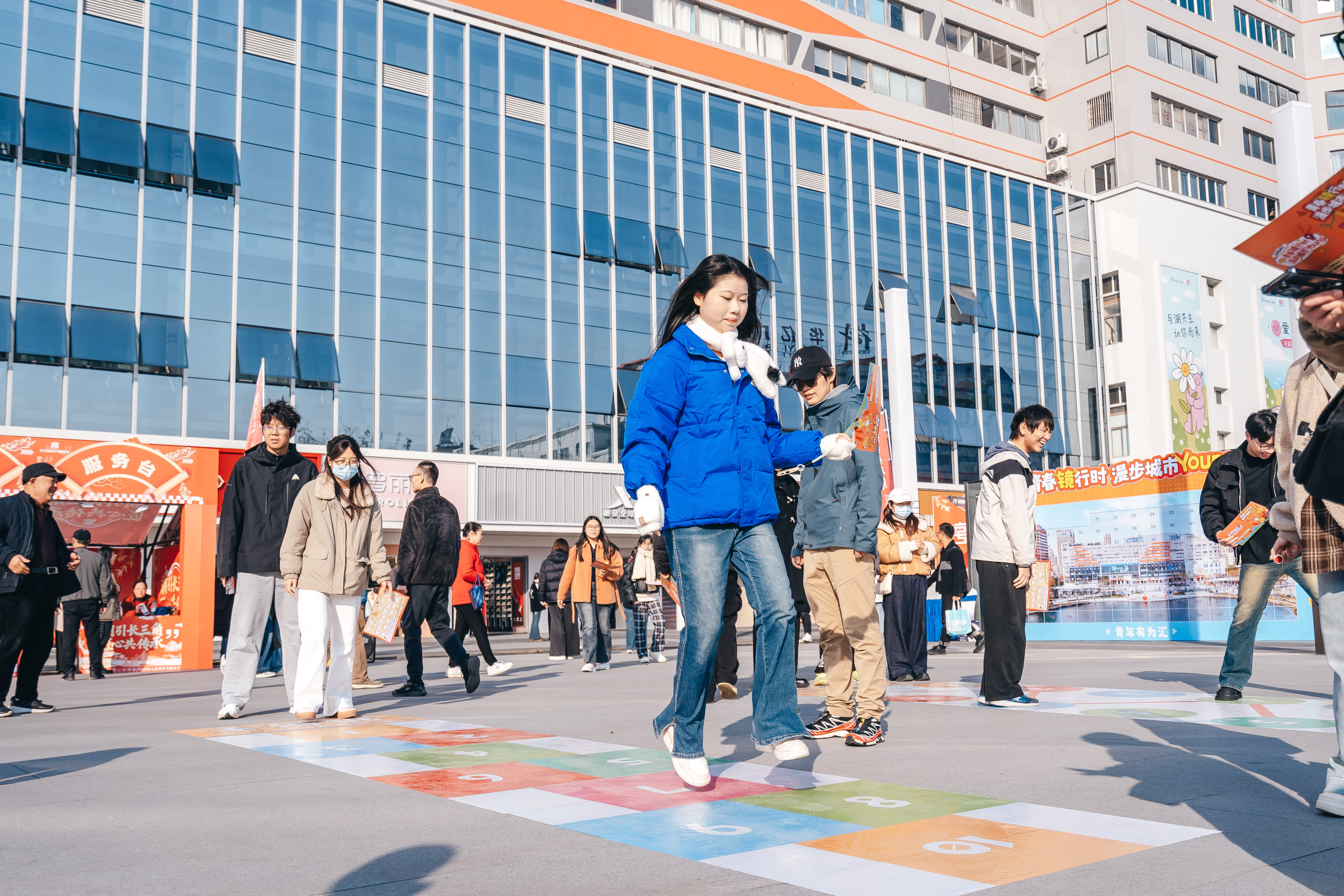 活动伊始,同学们领取专属“集章卡”,开启趣味打卡之旅。现场设置【潮玩福利社】、【青春活力带】、【美食能量站】、【青年拼图墙】等多个主题区域打卡点,同学们纷纷前往互动区进行挑战。一块块拼图在大学生们手中汇聚,逐渐勾勒出青春与城市交融的美好蓝图,中山路步行街上青年学子的身影展现着城市的蓬勃朝气。