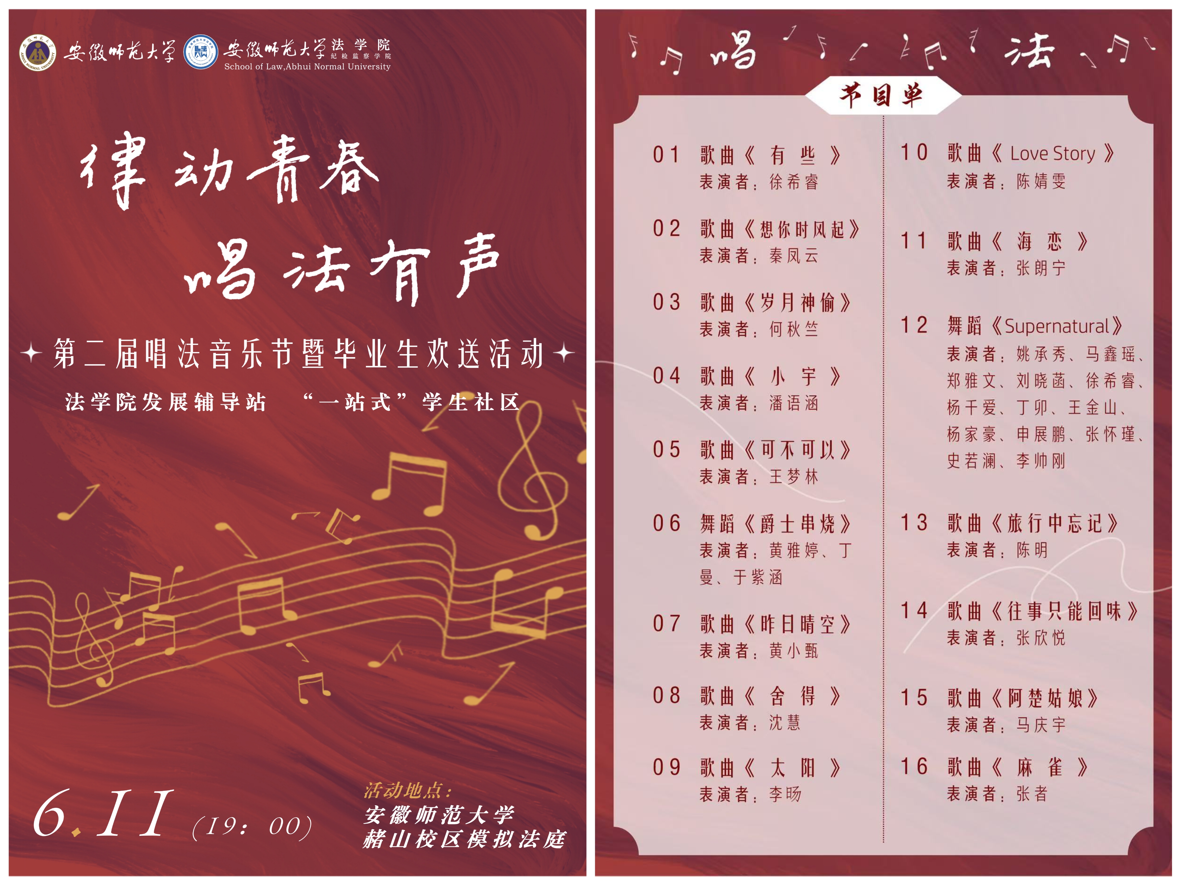 为进一步丰富校园文化生活,扎实推进校园精神文明建设,6月11日,法学院发展辅导站于模拟法庭成功举办第二届“一站式”学生社区“唱法”音乐节暨毕业生欢送活动。法学院党委书记赵红,院长郭泽强,党委副书记张玉新,副院长陈银珠与教师代表出席活动,共同见证这场凝聚青春力量的盛会。活动旨在通过艺术形式为学子搭建多元成长平台,多渠道护航学子成长。