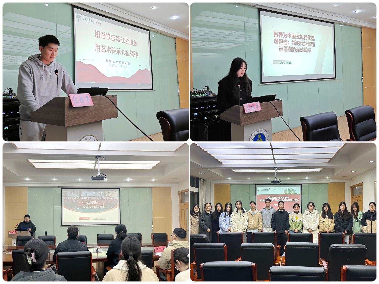 分享会上,各实践团队通过视频、图文、实物展示等形式汇报成果。本次寒假社会实践活动,美术学院2023级、2024级本科生全员参与,在七个课题方向共形成调研报告40份,短视频7份,其他作品63份,读书心得64份,组图14份。全方位展现了美院学子知行合一、服务社会的青春风貌。学院团委书记宋雨庭在总结中强调,社会实践是青年成长的 “必修课”,未来将进一步深化“行走的思政课”实践育人内涵,引领青年学子投身社会实践,锻炼能力,增长才干,为家乡建设贡献青春力量。