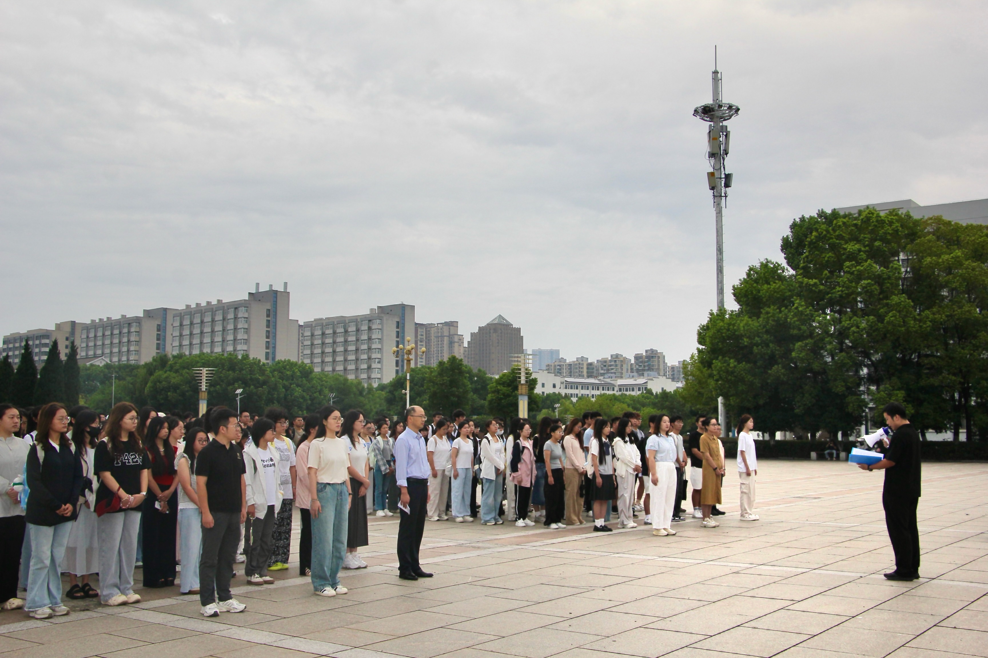 本网讯(图/舒健平 文/高雪)2025年9月11日早晨,历史学院在花津校区敬文图书馆东侧广场开展了“国旗下的思政课”主题校园升旗活动。学院党委副书记宫超、团委书记郭忠尧、全体专兼职辅导员及各年级学生代表共同参与活动。