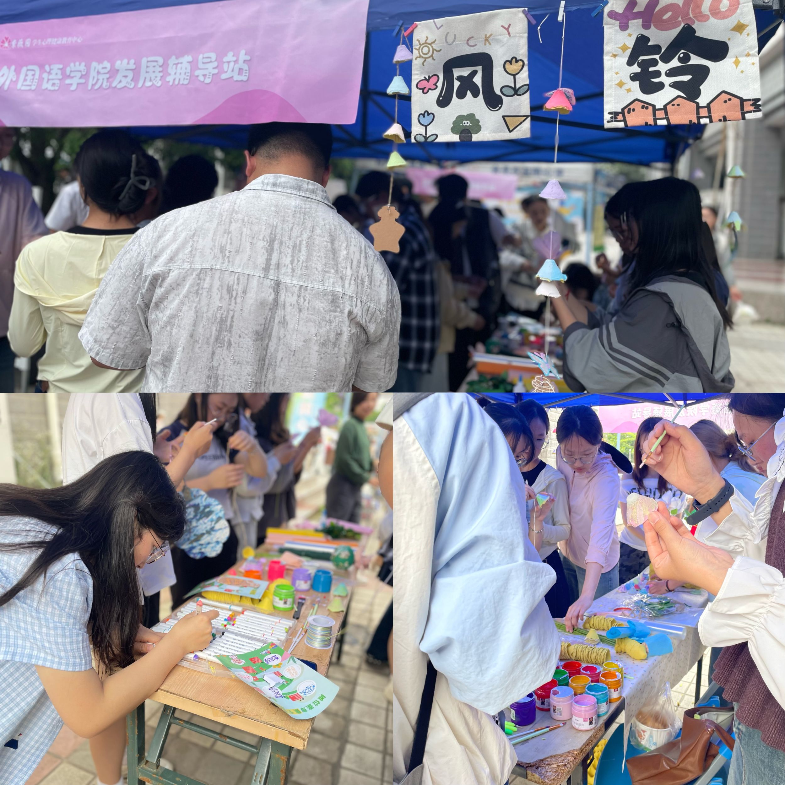 5月26日,在学校心理健康中心的统一组织下,学院发展辅导站在二食堂广场开展了“手作风铃,共鸣情感”趣味手工活动。参与者利用不同的材料制作风铃,并在卡片上写下激励性的英文单词句子错落挂起,用笔让心情变成风中闪光的蜕变,借助“声音疗愈”释放压力。