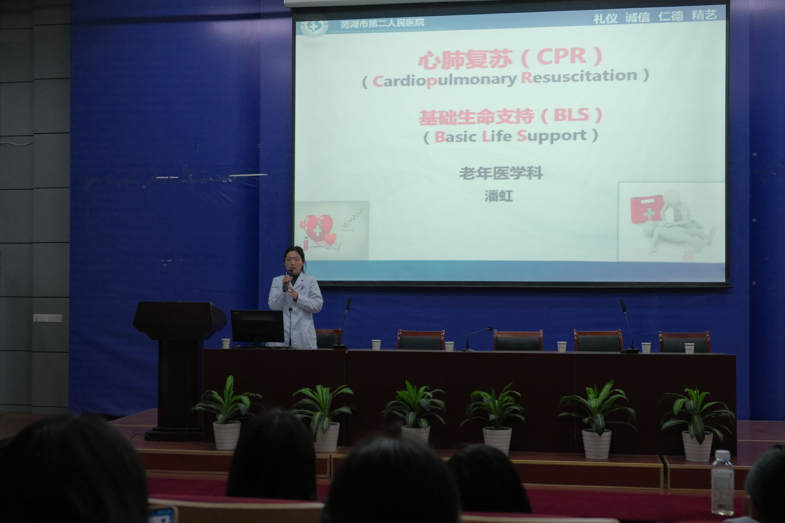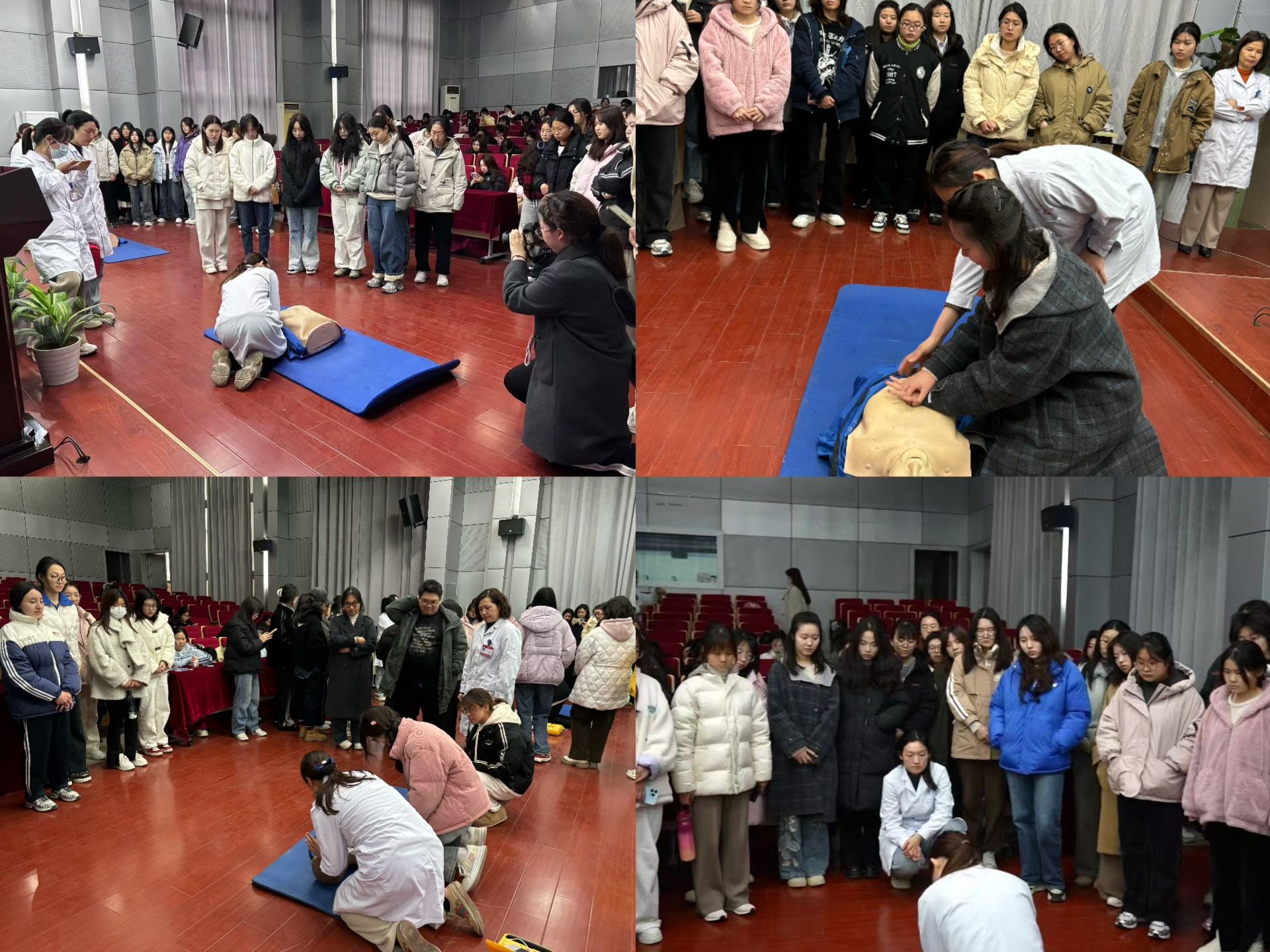 讲座后半程,潘虹医师带来心肺复苏(CPR)和基础生命支持(BLS)急救知识培训。她结合步骤讲解与实际案例,强调急救知识在日常生活中的关键作用。随后,芜湖二院随行医师通过人体模型进行现场实操演示,同学们认真观摩、踊跃参与演习,学习热情高涨。