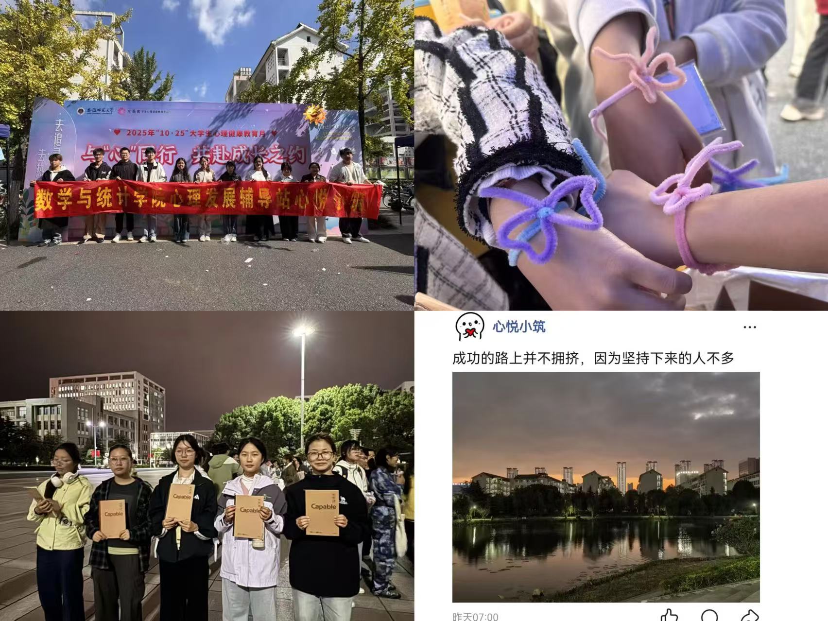 为进一步加强我校大学生心理健康教育工作,普及心理健康知识,缓解学生在学习、生活中的心理压力,帮助学生树立积极乐观的心态,落实大学生护航行动计划身心护航的具体要求,在“10·25”心理健康日来临之际,数学与统计学院大学生心理健康发展辅导站“心悦小筑”开展了一系列丰富多彩的心理健康教育活动。