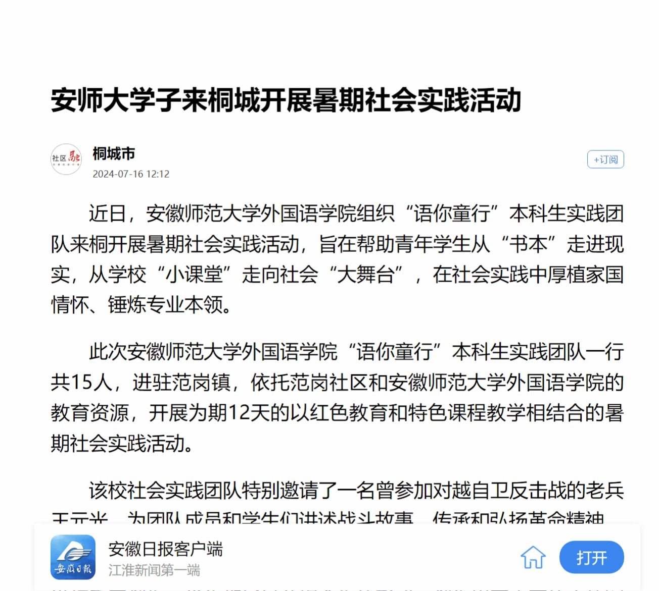 近日,安徽师范大学外国语学院组织“语你童行”本科生实践团队来桐开展暑期社会实践活动,旨在帮助青年学生从“书本”走进现实,从学校“小课堂”走向社会“大舞台”,在社会实践中厚植家国情怀、锤炼专业本领。