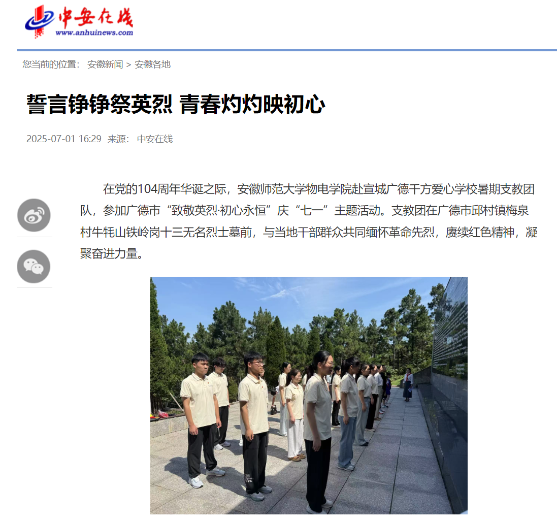在党的104周年华诞之际,安徽师范大学物电学院赴宣城广德千方爱心学校暑期支教团队,参加广德市“致敬英烈·初心永恒”庆“七一”主题活动。支教团在广德市邱村镇梅泉村牛牦山铁岭岗十三无名烈士墓前,与当地干部群众共同缅怀革命先烈,赓续红色精神,凝聚奋进力量。