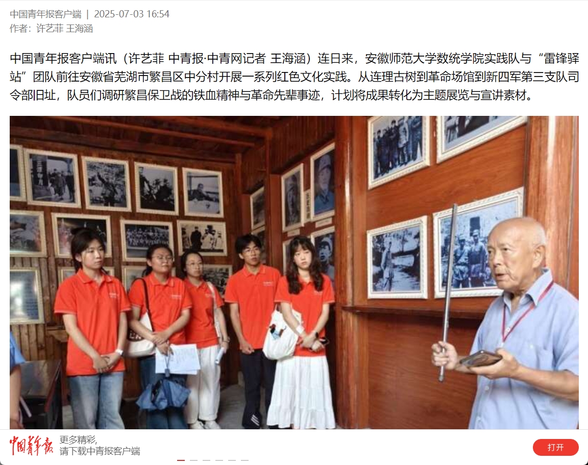 中国青年报客户端讯(许艺菲 中青报·中青网记者 王海涵)连日来,安徽师范大学数统学院实践队与“雷锋驿站”团队前往安徽省芜湖市繁昌区中分村开展一系列红色文化实践。从连理古树到革命场馆到新四军第三支队司令部旧址,队员们调研繁昌保卫战的铁血精神与革命先辈事迹,计划将成果转化为主题展览与宣讲素材。