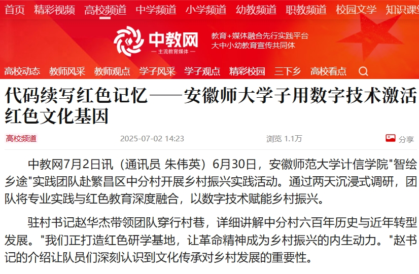 中教网7月2日讯(通讯员 朱伟英)6月30日,安徽师范大学计信学院"智绘乡途"实践团队赴繁昌区中分村开展乡村振兴实践活动。通过两天沉浸式调研,团队将专业实践与红色教育深度融合,以数字技术赋能乡村振兴。