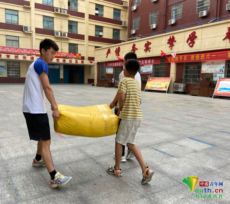 图为团队成员帮助小朋友们搬运包裹。中国青年网通讯员吕辰馨 供图