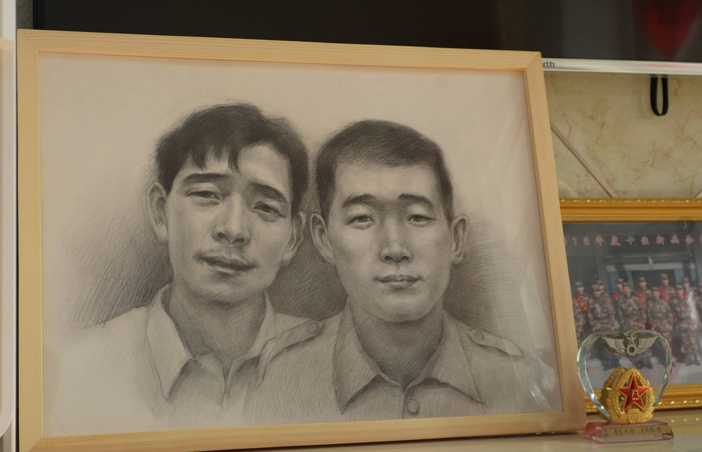 阳光透过玻璃洒在画像上,仿佛为父子俩的身影镀上了一层光晕,此刻,母子二人正拿起画像讲述当年一家人生活的点点滴滴。王伟凝视着这一幕深有感触:“能够让英雄父子同框不仅是圆梦了王涛,更是要将这样的英雄事迹传递给更多青年大学生,让他们懂得‘一个有希望的民族不能没有英雄,一个有前途的国家不能没有先锋’的真正含义。”
