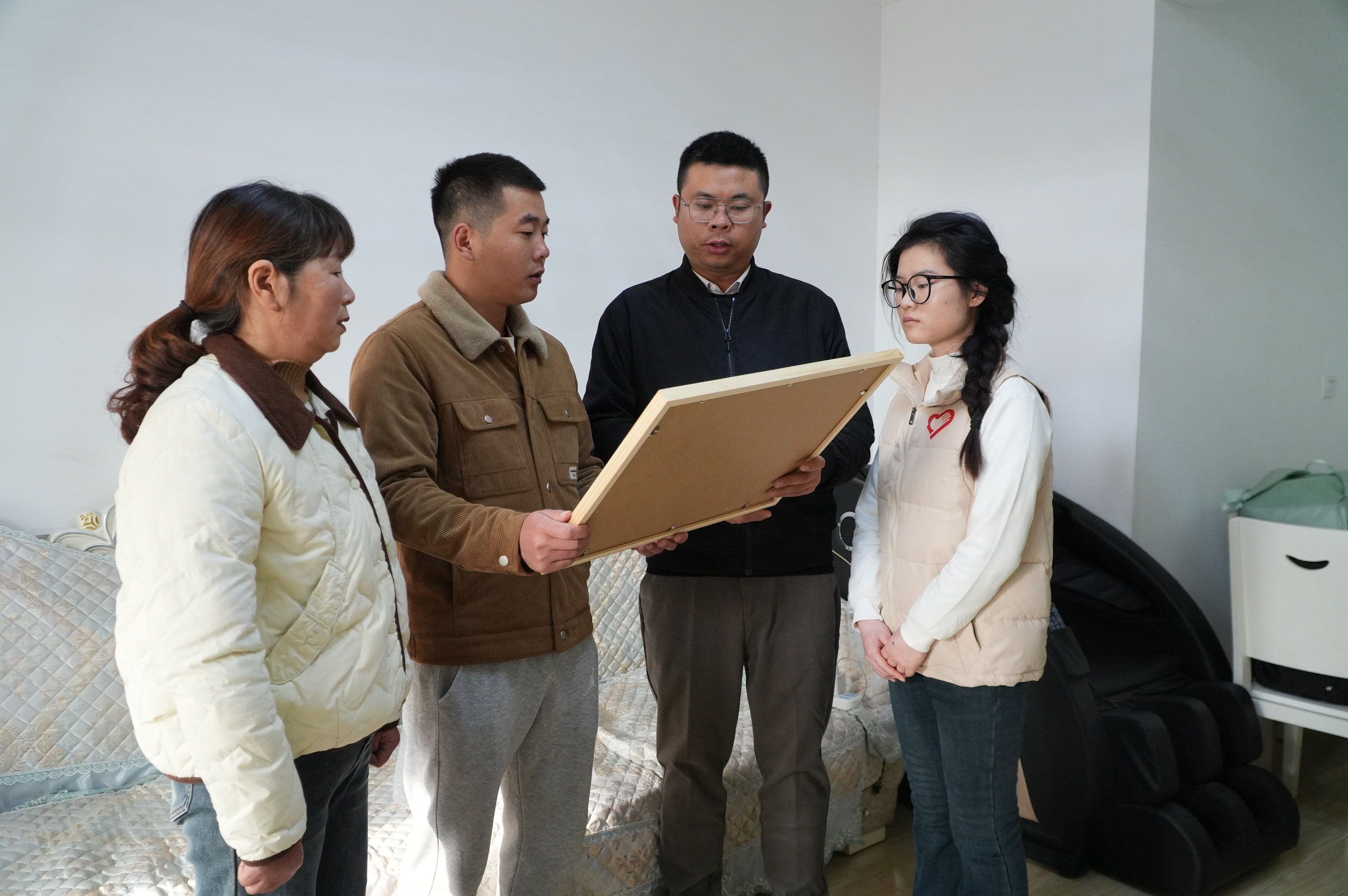 近日,安徽师范大学 “红色青春守护人” 志愿服务总队负责人王伟带领志愿者们刚走进王涛家,等候多时的王涛与母亲便快步迎了上来。当志愿者张昕睿双手捧起一幅精心装裱的画像递过去时,王涛的目光瞬间定格——画面中,年轻的父亲王志文身着便装,身旁的自己身着制服,父子俩并肩而立,笑容温暖而坚定。
