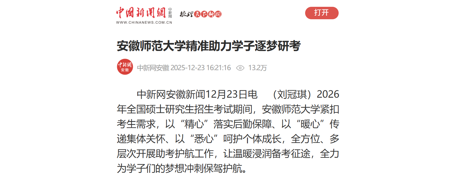 从立体服务到贴心守护,从群体保障到个体关怀,安徽师范大学用一系列精准务实的举措,为考研学子搭建起逐梦的“阶梯”,激励他们在人生的新征程上勇敢前行。
