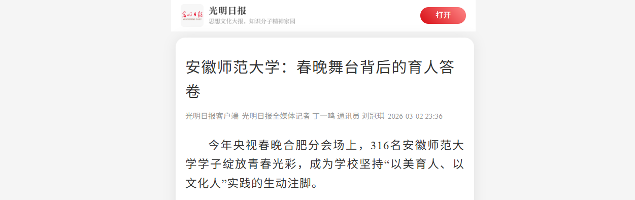 今年央视春晚合肥分会场上,316名安徽师范大学学子绽放青春光彩,成为学校坚持“以美育人、以文化人”实践的生动注脚。