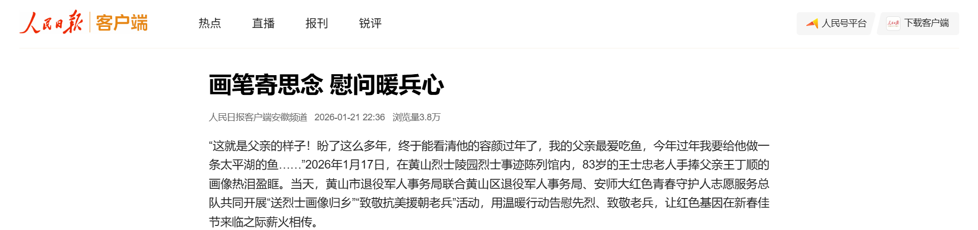 “这就是父亲的样子!盼了这么多年,终于能看清他的容颜过年了,我的父亲最爱吃鱼,今年过年我要给他做一条太平湖的鱼……”2026年1月17日,在黄山烈士陵园烈士事迹陈列馆内,83岁的王士忠老人手捧父亲王丁顺的画像热泪盈眶。当天,黄山市退役军人事务局联合黄山区退役军人事务局、安师大红色青春守护人志愿服务总队共同开展“送烈士画像归乡”“致敬抗美援朝老兵”活动,用温暖行动告慰先烈、致敬老兵,让红色基因在新春佳节来临之际薪火相传。
