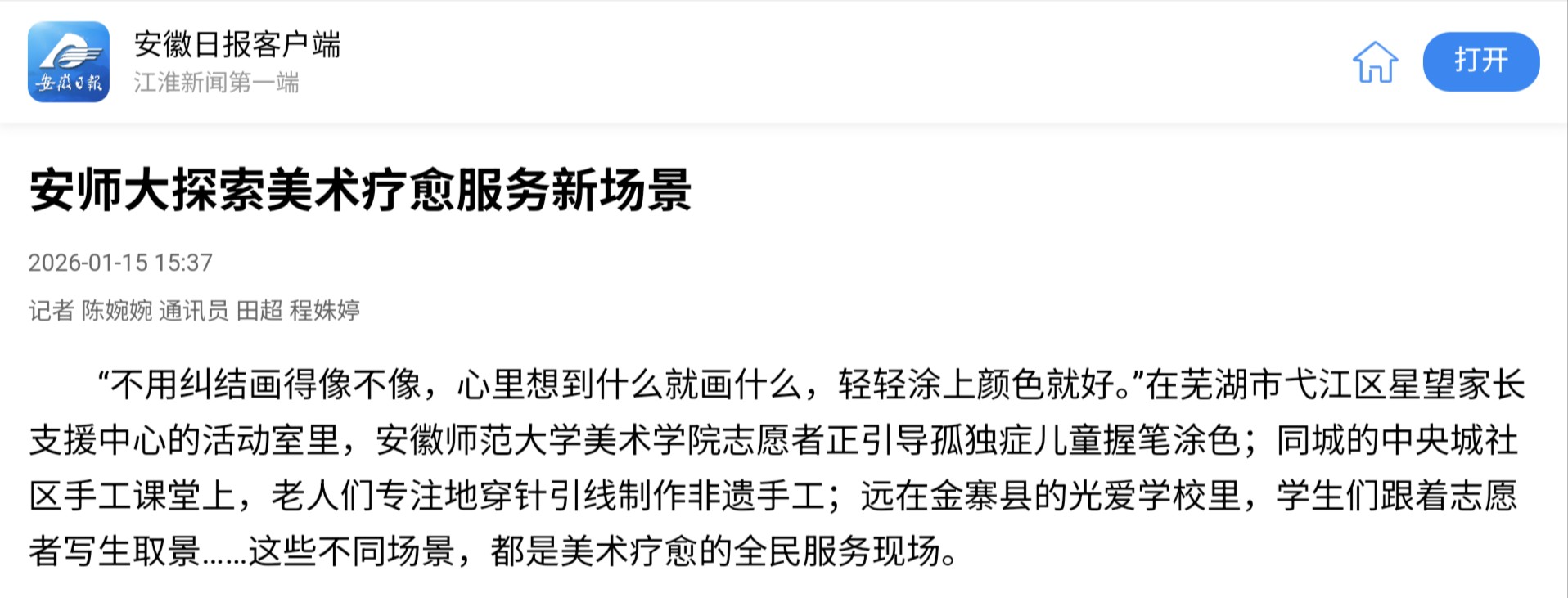 2025年底,安徽师范大学依托美术学、心理学、教育学学科优势,正式成立“美术疗愈实验中心”。这是一个集理论研究、人才培养与社会服务于一体的综合性平台,既推动美术教育转型和应用升级,拓宽学生就业路径,更以艺术之力守护全民心理健康。