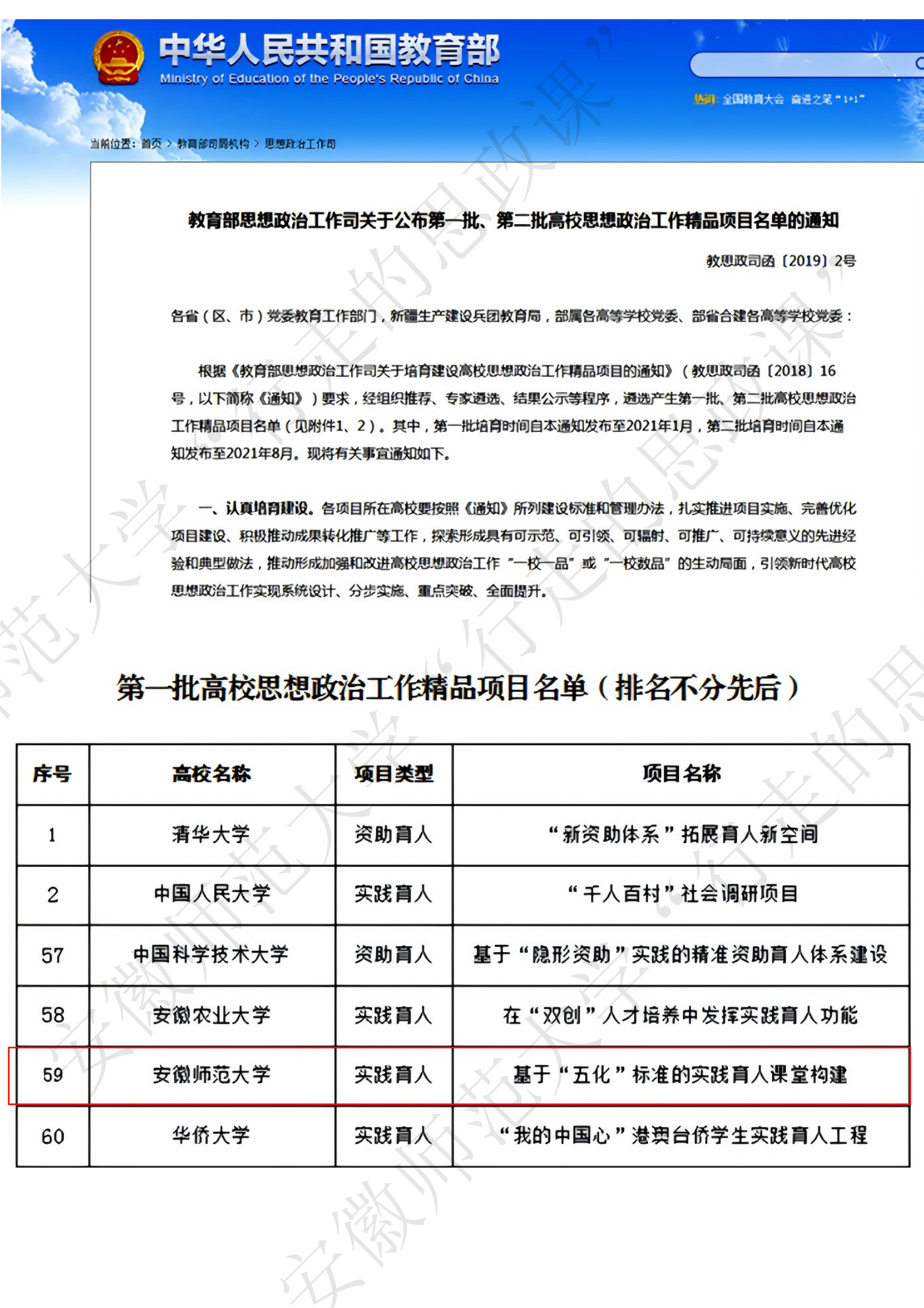 教育部思想政治工作司关于公布第一批、第二批高校思想政治工作精品项目名单的通知