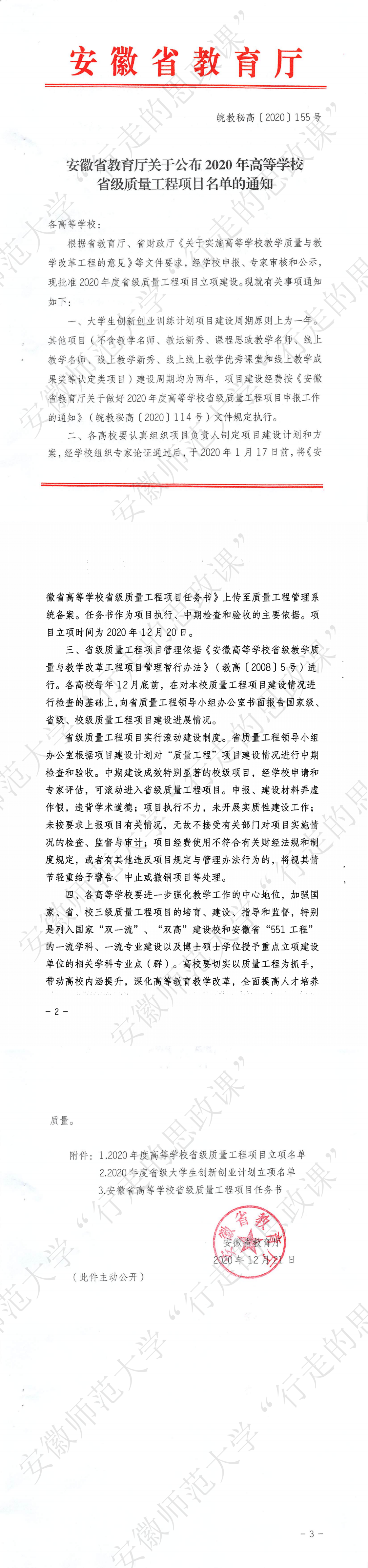 安徽省教育厅关于公布2020年高等学校省级质量工程项目名单的通知