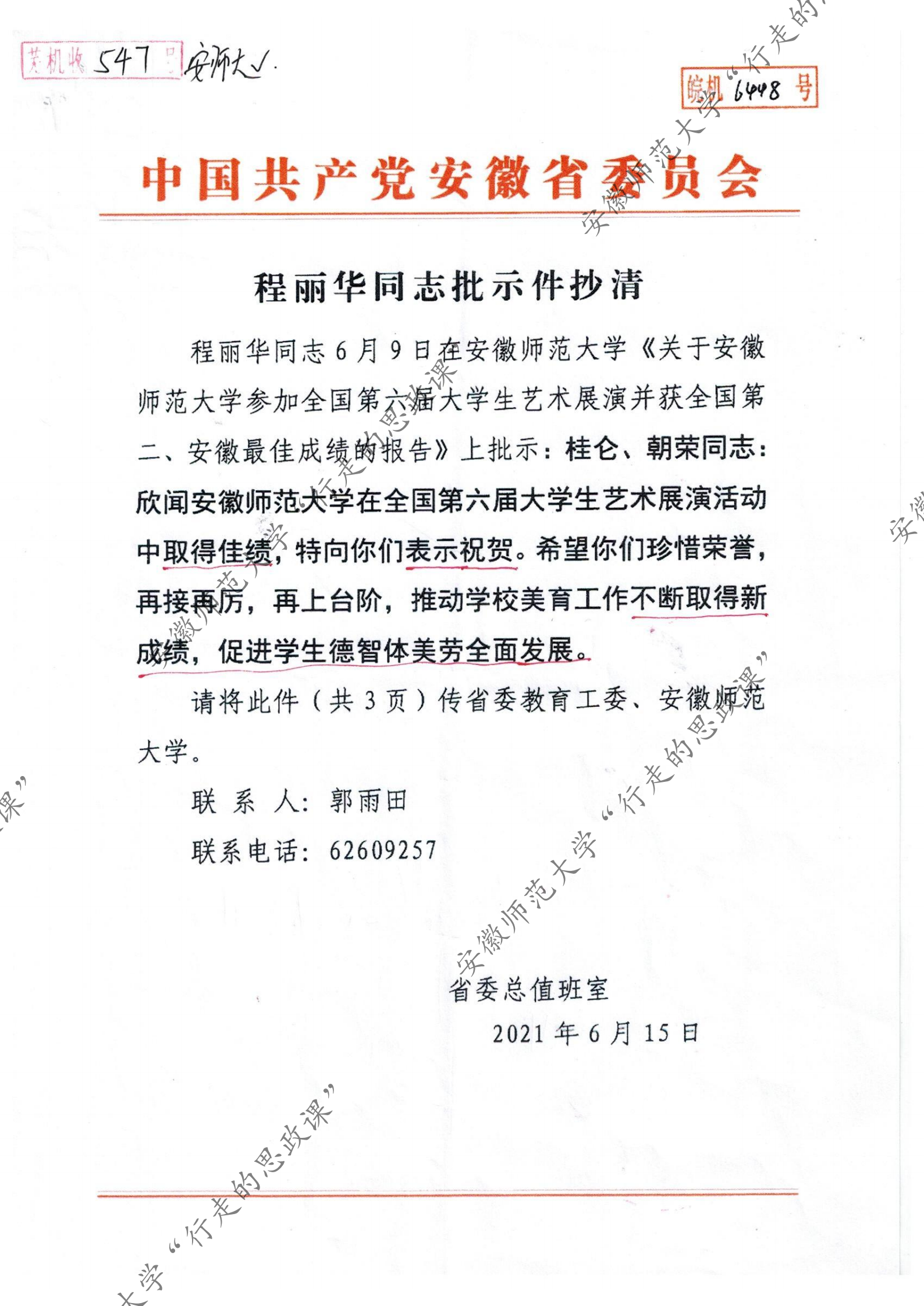 省委副书记程丽华在安徽师范大学《关于安徽师范大学参加全国第六届大学生艺术展演并获全国第二、安徽最佳成绩的报告》上的批示
