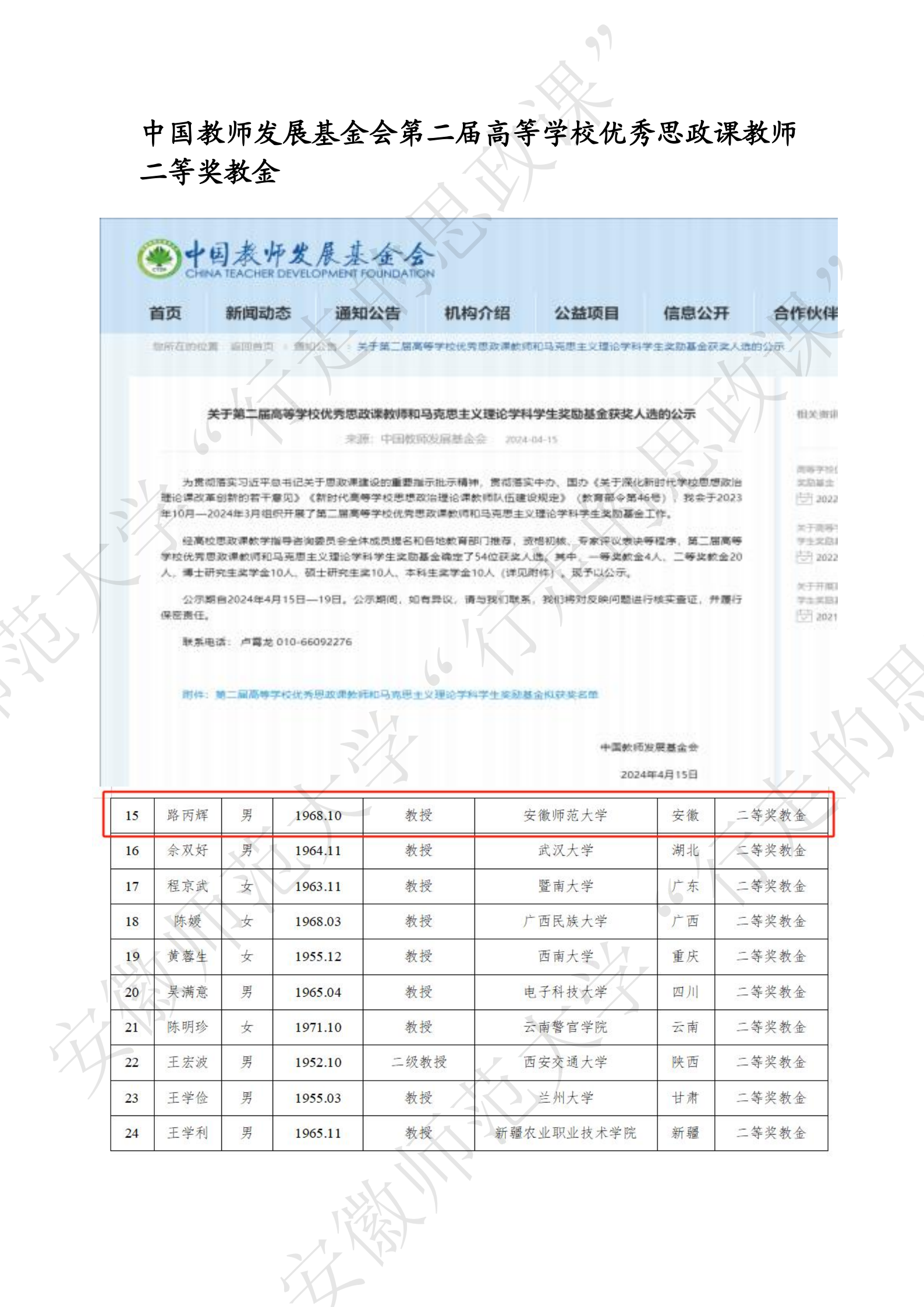 中国教师发展基金会第二届高等学校优秀思政课教师二等奖教金